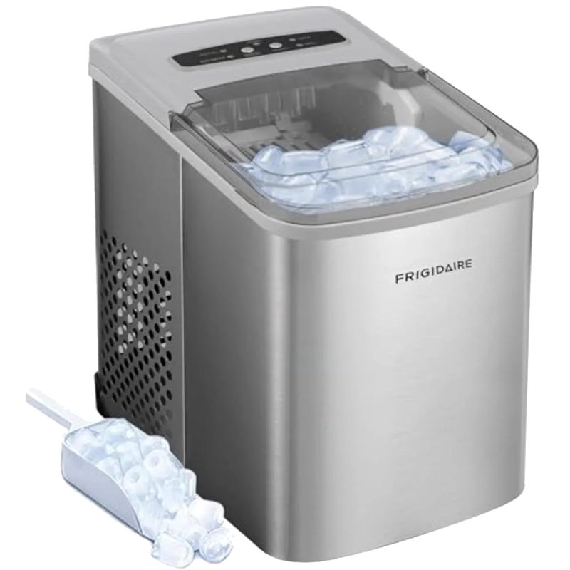 - Sleek Design – Never run out of ice again with the Frigidaire Ice Maker that produces up to 26 lbs. of ice per day. Elevate your space with its sleek stainless steel countertop design that blends seamlessly with any kitchen, bar, office, or dorm.