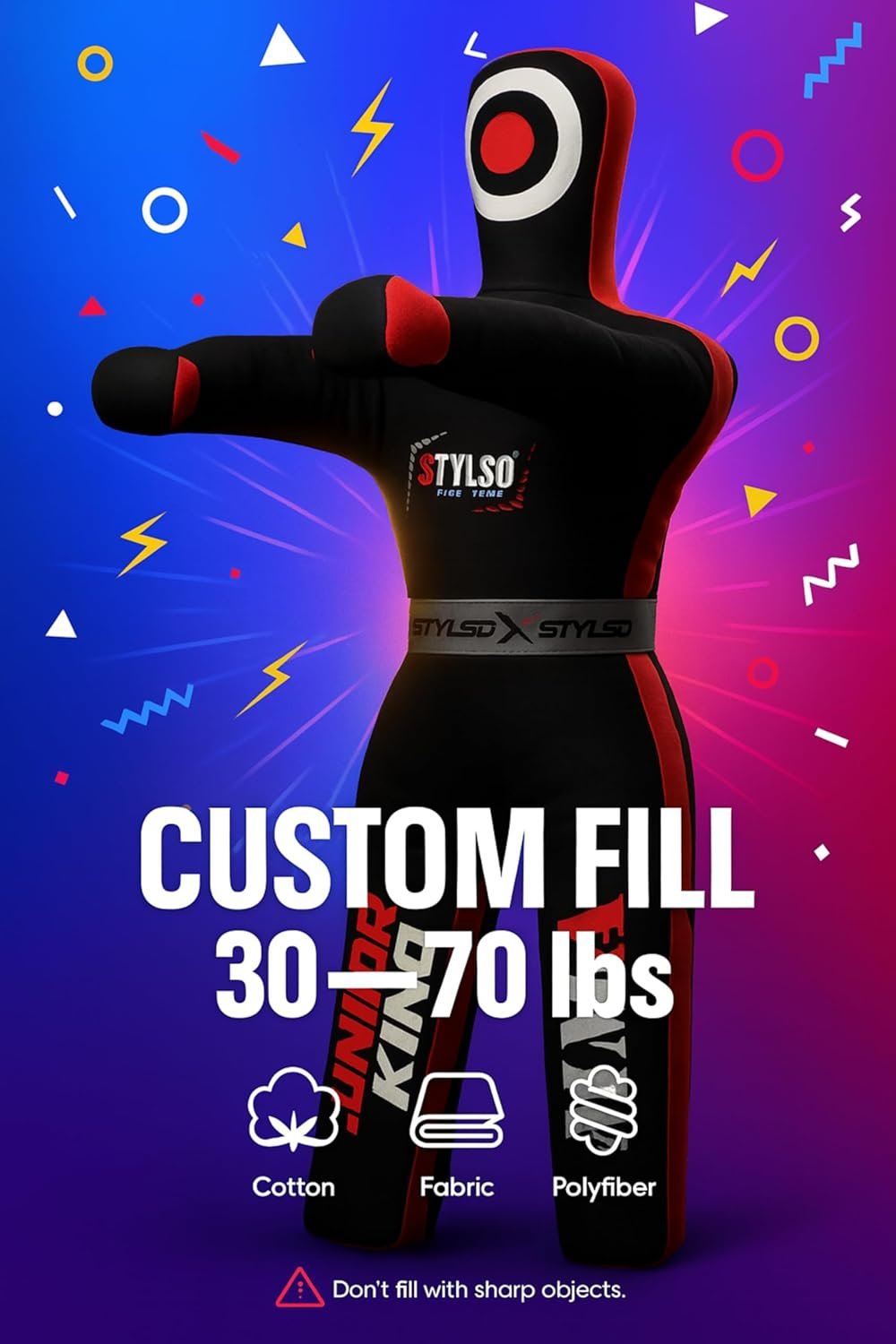 - 📦 Unfilled Design – Adjustable Weight & Firmness Control the dummy’s weight using cotton, fabric, polyester, foam, or shredded cloth. Easy to empty, refill, and store as your child grows stronger. (Unfilled dummy – filler not included.)